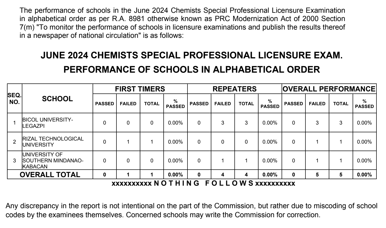 PRC announced that no one passed the June 2024 Chemists SPLE. Five (5) examinees took the exams.