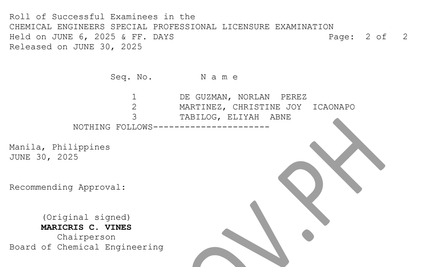 PRC recognizes the top 10 examinees who garnered the highest examination ratings in its administered licensure exams. Below is the list of the top 10 examinees in the June 2025 SPLE for Chemical Engineers, including their school and rating.