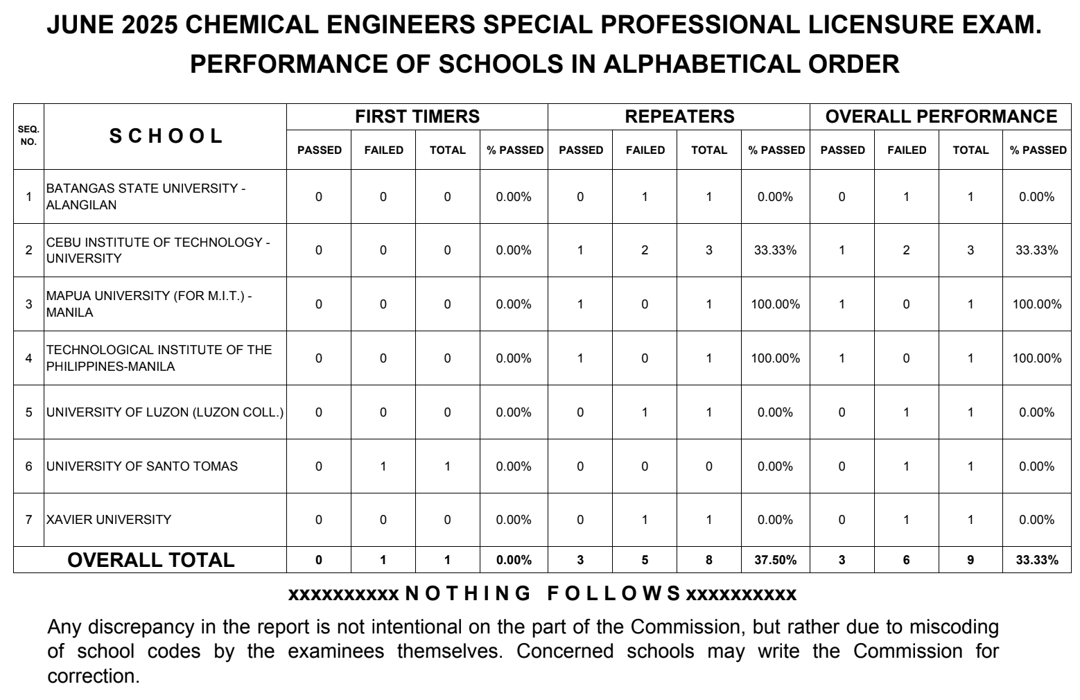 The performance of schools for June 2025 SPLE for Chemical Engineers in alphabetical order as per R.A. 8981, otherwise known as the PRC Modernization Act of 2000, Section 7 (m), or “to monitor the performance of schools in licensure examinations and publish results thereof in a newspaper of national circulation.”