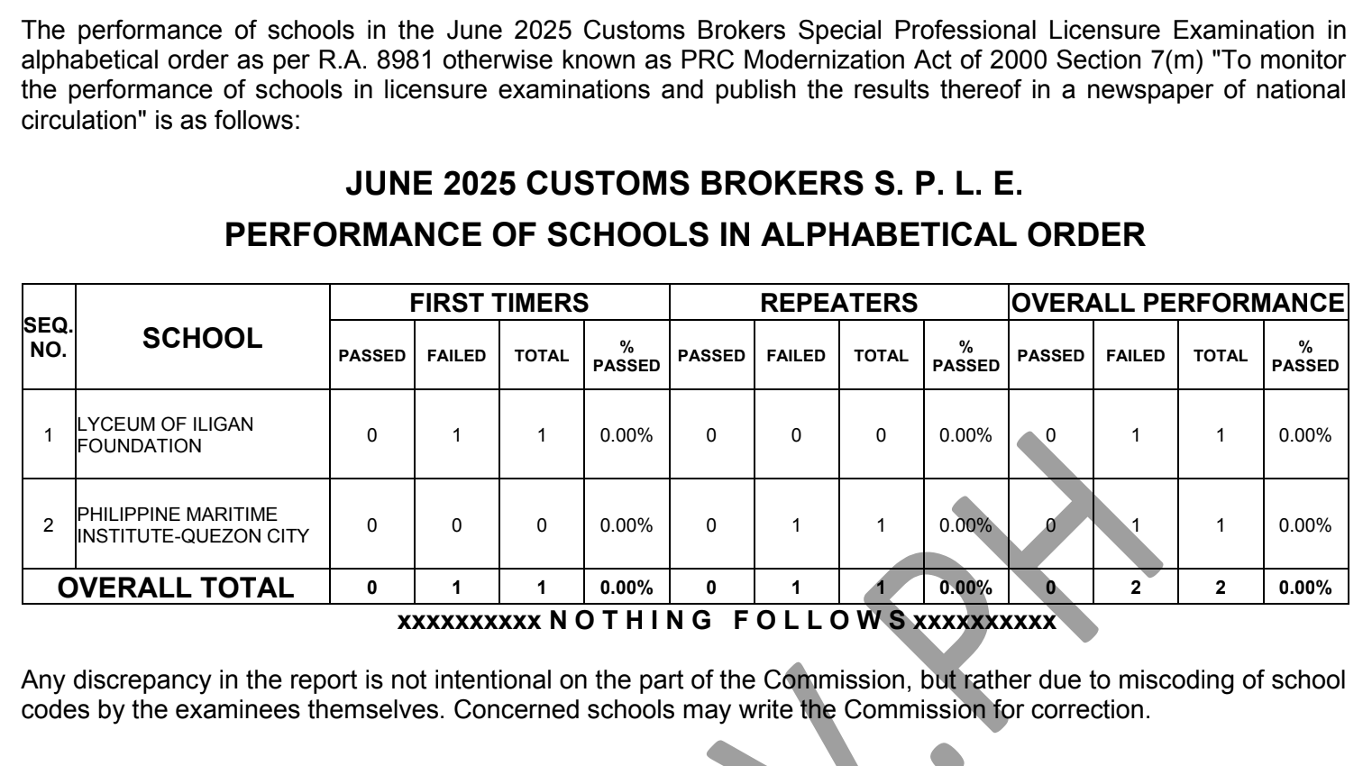 The performance of schools for June 2025 SPLE for Customs Brokers in alphabetical order as per R.A. 8981, otherwise known as the PRC Modernization Act of 2000, Section 7 (m), or “to monitor the performance of schools in licensure examinations and publish results thereof in a newspaper of national circulation.”