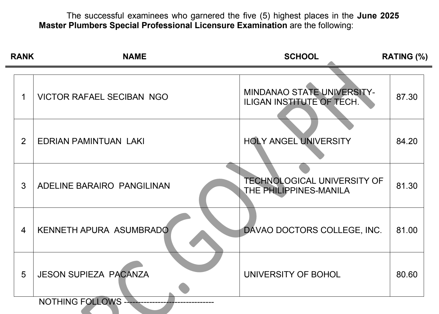 PRC recognizes the top 10 examinees who garnered the highest examination ratings in its administered licensure exams. Below is the list of the top 5 examinees in the June 2025 SPLE for Master Plumbers, including their school and rating.