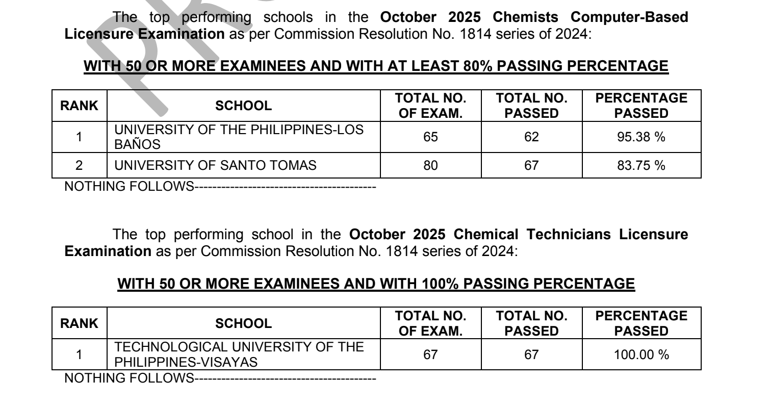 MANILA – The Professional Regulation Commission (PRC) announces the list of top-performing schools and a summary of schools’ performances in the October 2025 Chemistry licensure exams within five (5) working days after the last day of exams.