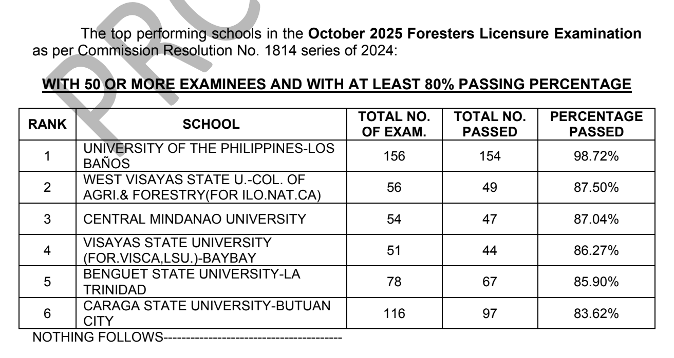 Below are the October 2025 Forester licensure exams’ top-performing schools, with 50 or more examinees passing and at least an 80% overall passing percentage, as per Commission Resolution No. 2017-1058 (C) series of 2017, courtesy of PRC.