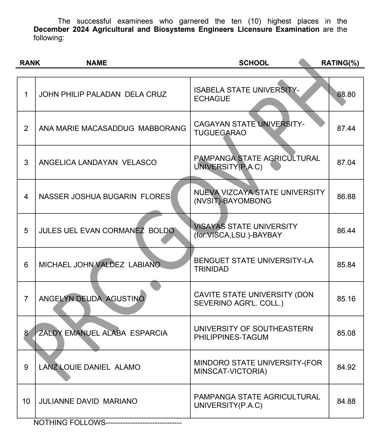 - List of Passers: December 2024 Agriculture and Biosystems Engineering Board Exam Results