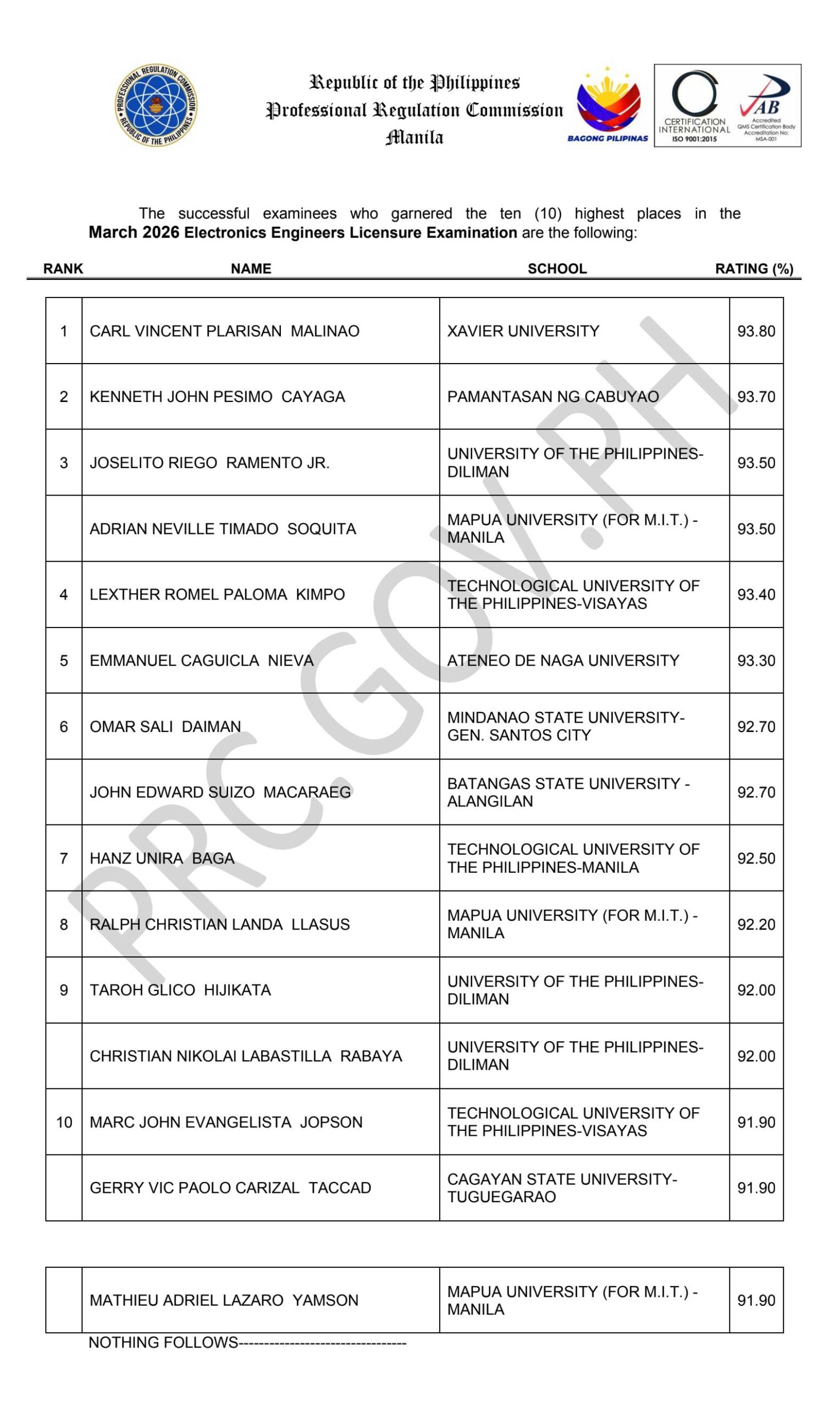 - Top 10: March 2026 Electronics Technician Licensure Exam Results