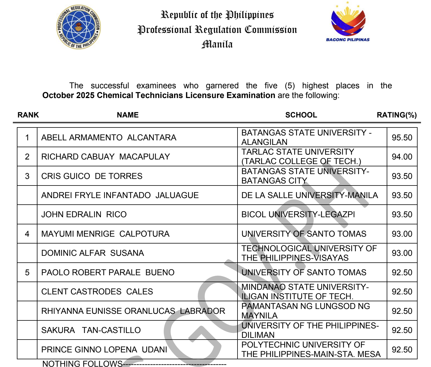 MANILA – The list of topnotchers or the top 10 examinees in the October 2025 Chemical Technician board exams is available on this website as the Professional Regulation Commission (PRC) Board for Chemistry releases the full results five (5) working days after the administration of exams.