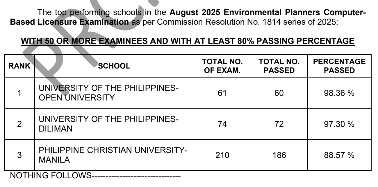 The Professional Regulation Commission (PRC) announces the summary performance of schools and the list of top-performing schools in the August 2025 Environmental Planner Licensure Exam (EPLE) immediately after the exams.