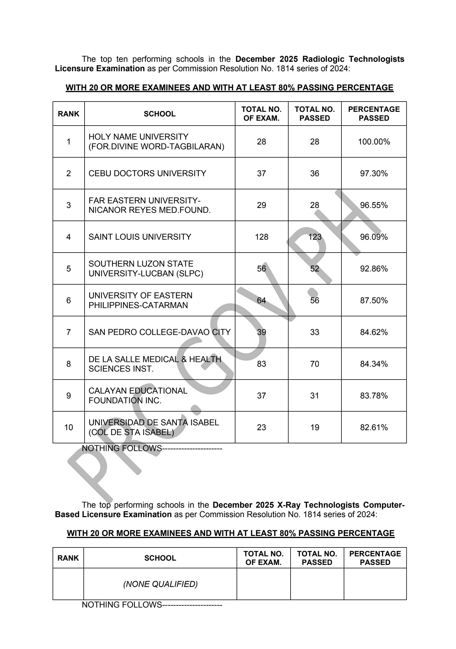 PRC acknowledges the top schools (colleges and universities) in the December 2025 Radiologic Technologist licensure exams.