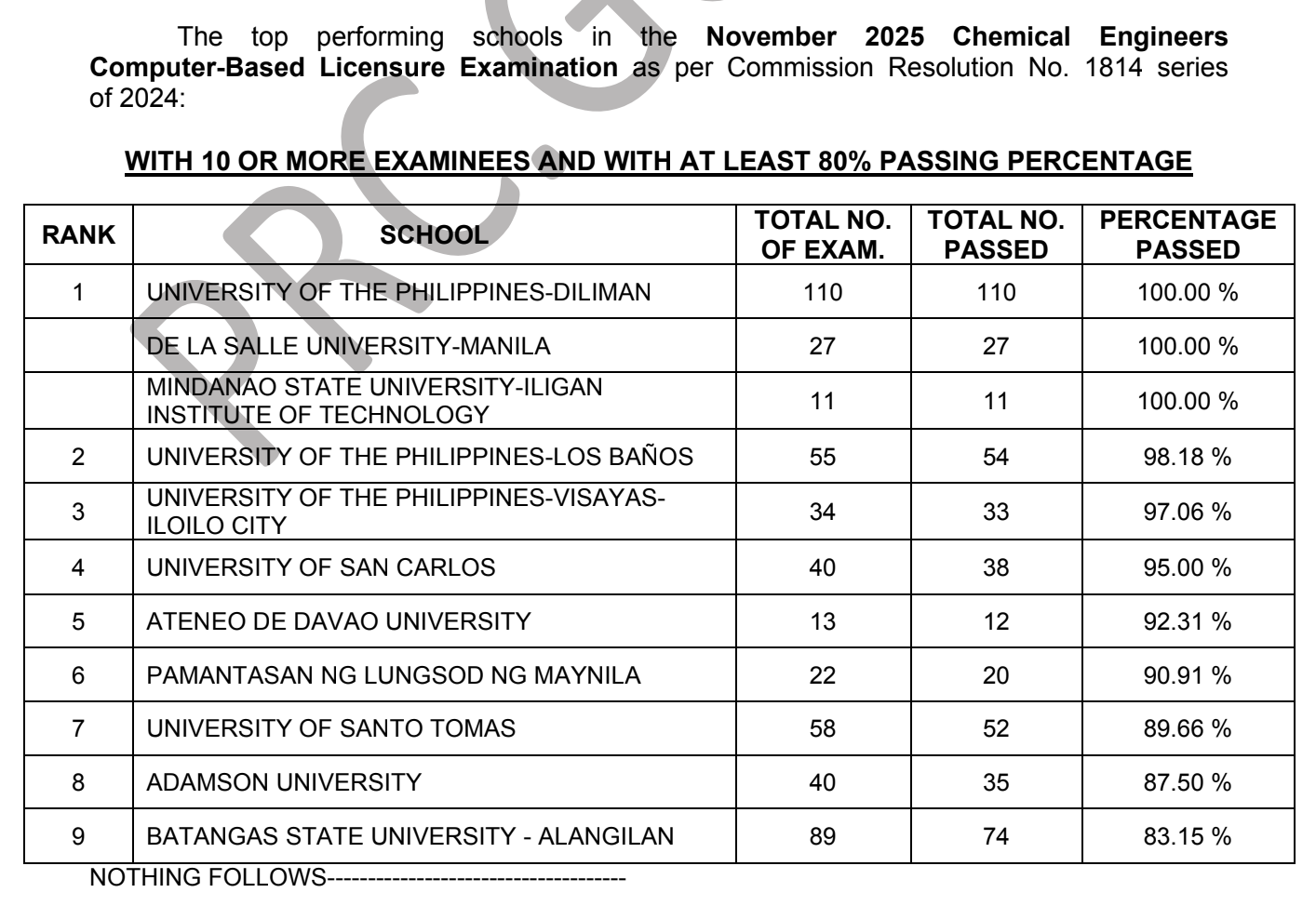 - Top 10 Examinees: November 2025 Chemical Engineer Licensure Exam Results