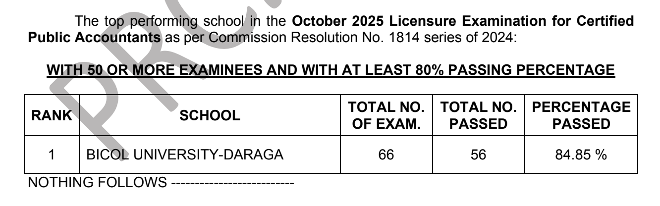 The Professional Regulation Commission (PRC) announces the list of top-performing schools and a performance summary of all schools in the October 2025 Certified Public Accountant (CPA) Licensure Exam (CPALE), five (5) working days after the last day of exams.