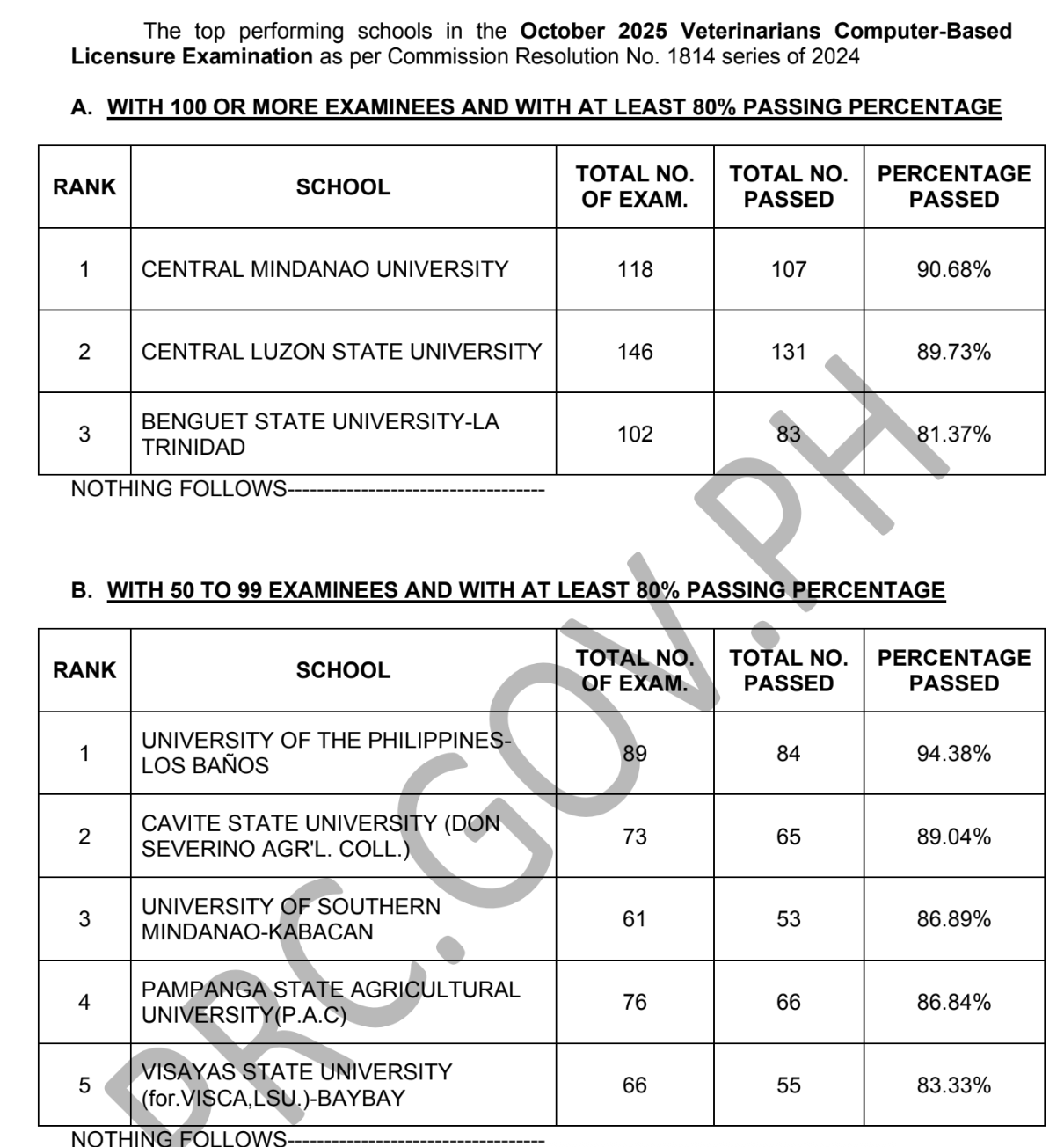 Below are the top-performing schools for the October 2025 Veterinarian licensure exams, with 100 or more examinees passing and an overall passing percentage of at least 80%, as per Commission Resolution No. 2017-1058 (C) series of 2017, courtesy of the PRC.